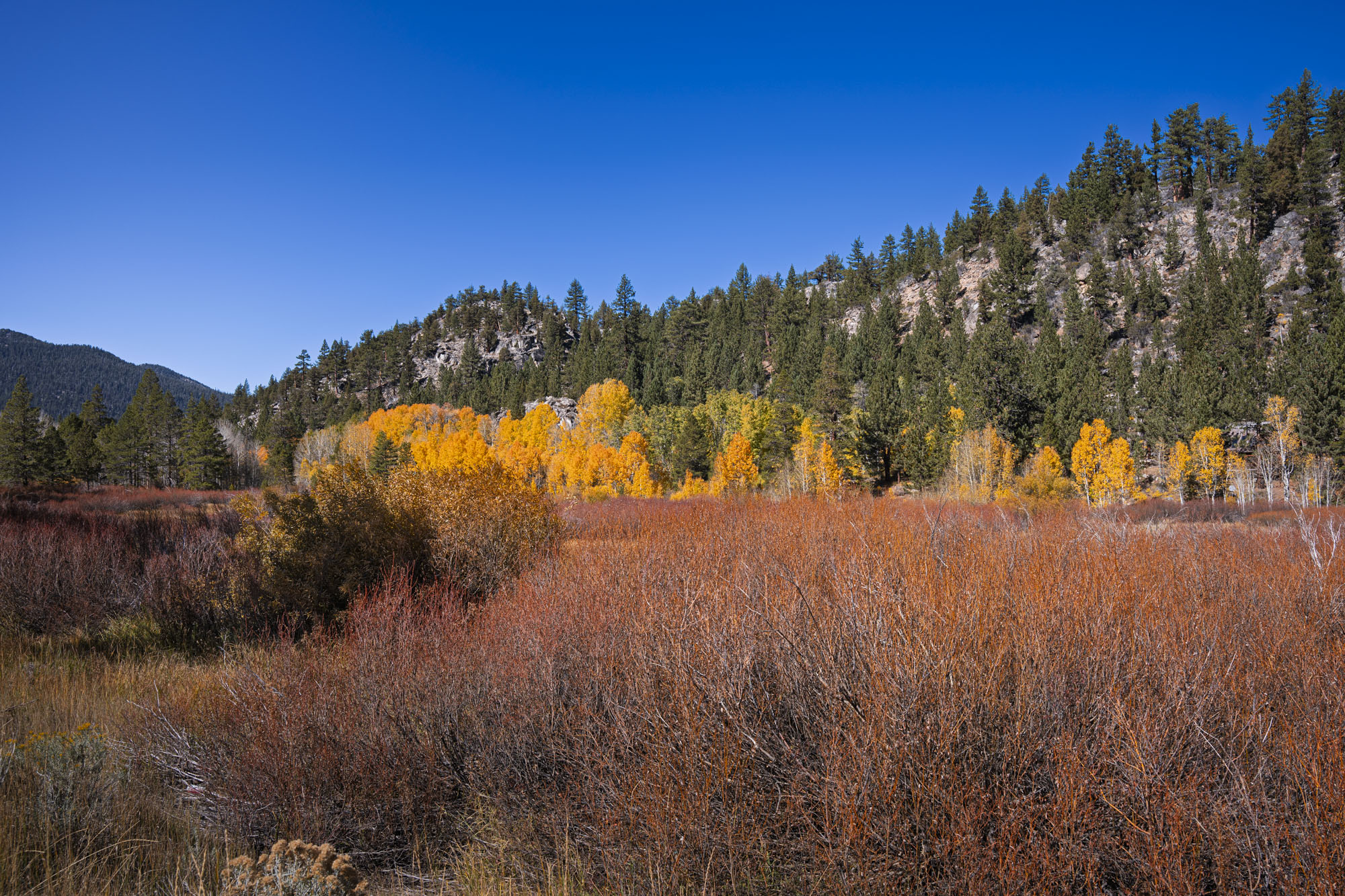 This scene is located in the town of Sorensens, California on highway 88. This photo was captured in early fall, showing layers of beautiful fall colors. The layers of colors in this scene are showcasing blues, greens, yellows, oranges and reds.