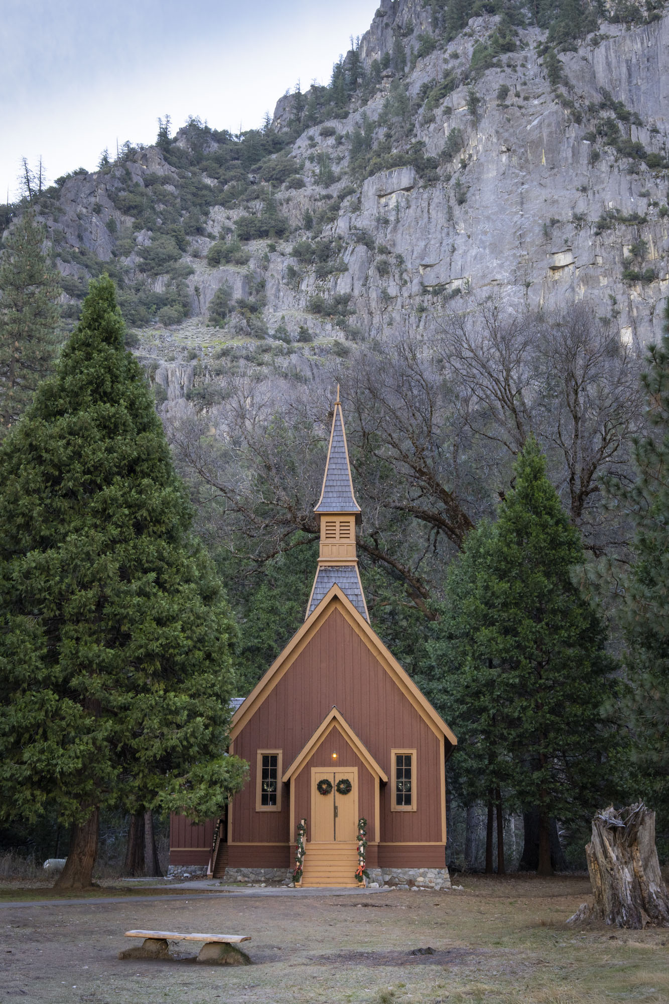The Yosemite Valley Chapel was originally built in 1879 is located in Yosemite Valley on Southside Drive. The chapel was not in this location until 1901. This photo was captured in December showcasing the holiday decorations on the chapel itself and the beauty surrounding it.