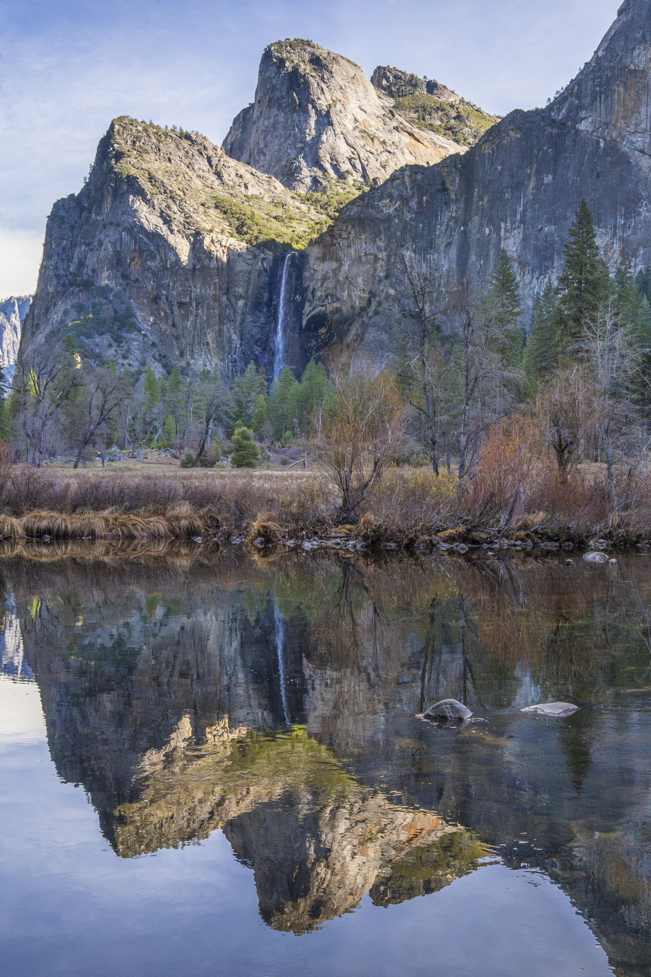 This photo is of late fall trickles of Yosemite Bridalveil Falls with the reflection in the Merced River. This photo was captured in December showcasing the symmetry with reflection in the water. This photo was taken on Northside Drive in Yosemite Valley.