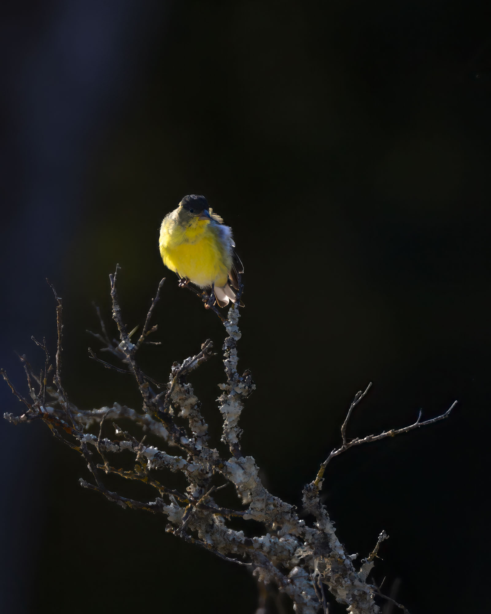 A morning photo of a beautifully colored Lesser Goldfinch with a dark background. This bird is looking about on top of this part of a bare tree. This photo was taken in the early morning in California. Lesser Goldfinches are symbolic of a good omen when you see one.